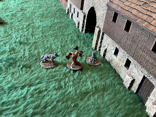 My vampiress looked to seek revenge but was taking potshots from more of the ungrateful rabble.This I thought was a bit iffy as normal bullets seemed to be doing her damage but alas that be the rules. My reinforcements came in the form of the dead coachmaster aided by another couple of wolves.Trailing behind the a long way off were thr my village mob from afar but my initial placement of them meant they were only going to be in at the death which actually meant their death as the local burgermeister had the ability to command an awful lot of the rabble to be freely commanded.